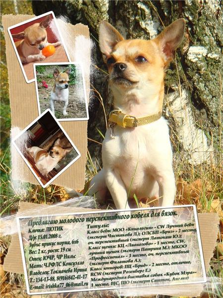 Ответ: Лютик Игрунка написал(а): Лютик Нажмите для раскрытия... Фото-класс! Профессиональные! Мальчишка мой идеал чихуа! вы его выставляете,вяжете? Нельзя такую красоту взаперти держать! Расскажите:сколько ему сейчас, какой вес.