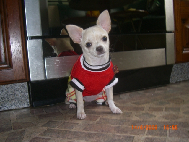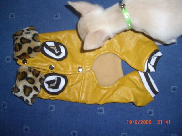 Спасибо большое, мы будет стараться быть модными. Вчера купили на осень комбинезончик (кож. зам на фланельке) будет хорошо в дождик и прохладу и всего за 390 руб. Около дома у нас маленький магазинчик, там всегда есть на маленьких собачек одежда, пусть не огромный выбор, но выбрать можно, цены смешные, у хозяйки магазина тоже чишка. Кому интересно могу написать адрес. Вот фотка