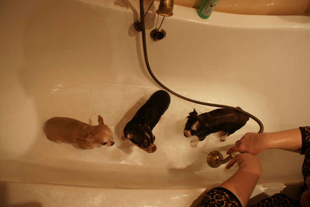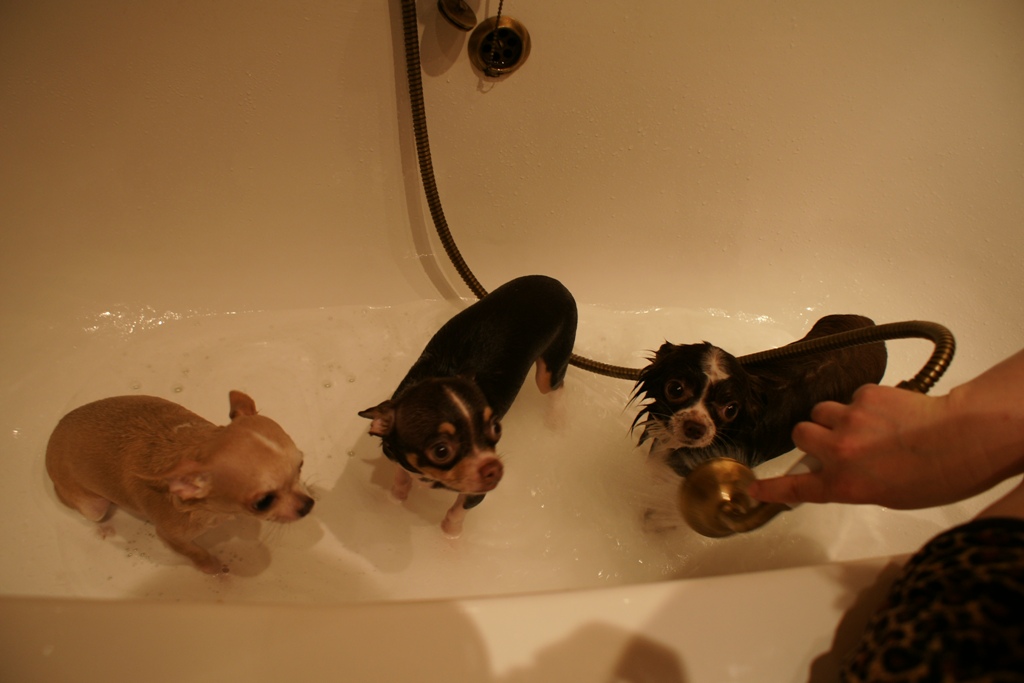 Мне с купанием повезло, Мишик был приучен заводчицей, а Келли и Данька нет, но не испугались совсем.
