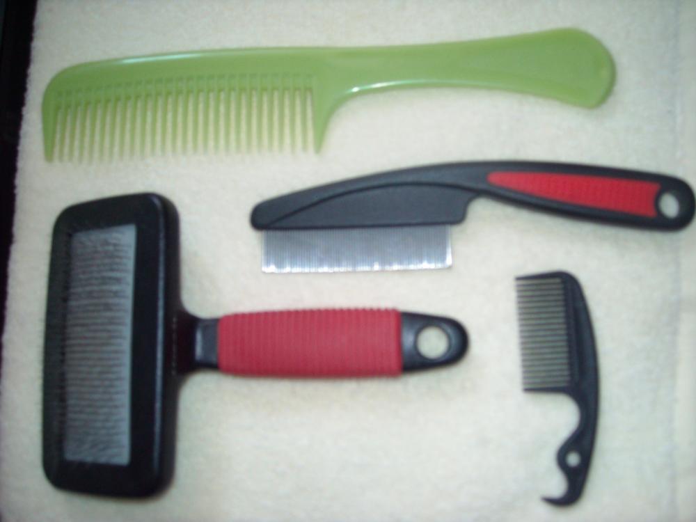 Вот наш арсенал-но я если честно не так часто причесываю собак.Если вижу,что шерсть не спутана,то не причесываю.Слышала противоречивые мнения-кто говорит надо часто чесать-это как массаж,кто говорит не надо,а то все вычешите и повредите луковицы.Вобщем как правильно-не знаю,а потому ленюсь:beach: