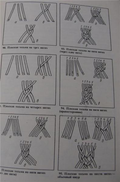 Лена, вот схема плетения оберега .Я плела схему N94 из пяти ниток,сначала берешь 5 красных ниточек по 50-60 см завязываешь узелком с кисточкой или без и прикалываешь этот узелок на маленькую подушку каждую ниточку по отдельности по порядку булавочкой с круглой головкой и плетешь ,не сильно затягивая веревочки.