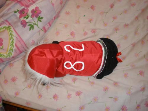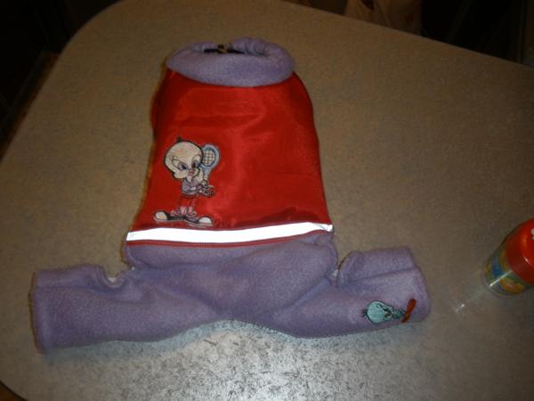 Вот, порезал свою старую курточку, плюс пришил воротник от старого гольфа, к этому всему пришил замок, прорезал и прошил дырки для лапок и вот: