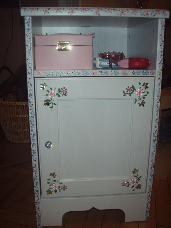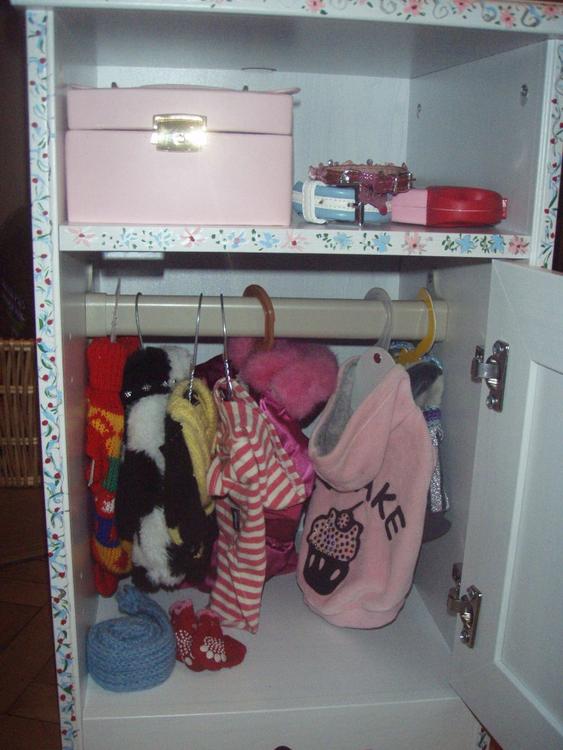 Может это не совсем для рубрики"шьем и вяжем сами", но всетаки сделанно руками..Купили в Икеи тумбочку..муж сделал внутри штангу для вешалок, а украсила..Получился такой вот шкафчик..