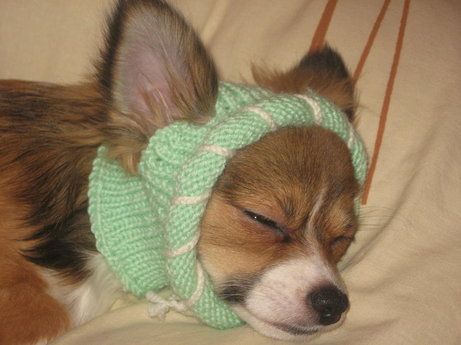 Всем приветик. Я такую шапочке своей Соне связала год назад,но у нас проблема она кожу на лице собирает и мордочка становится как у шарпея. Это конечно смешно,но и не удобно одновременно,собаке сложно в ней ходить. Шапку вязала с открытыми ушками,для лучшего слуха собаки. Вот и фоточки.