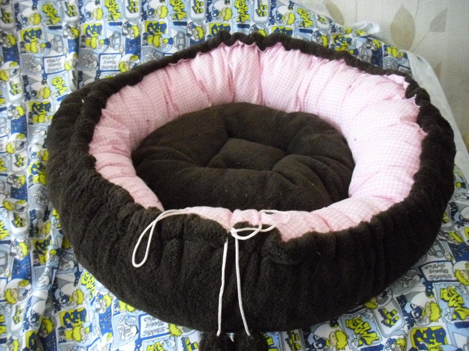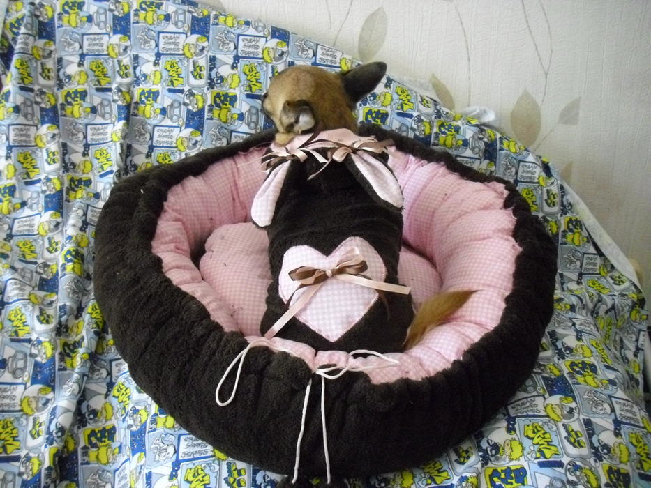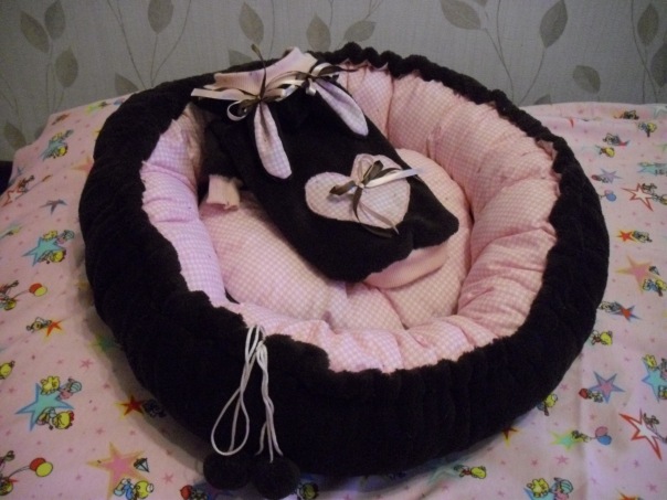 Вчера сшила на заказ новый лежачок из коричневого велсофта и розовой бязи,ну и толстовочку в дополнение к нему.Гуля заценила)))