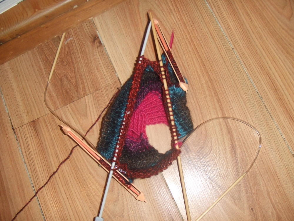только вот когда вы уже чувствуете,что линию реглана пора заканчивать уже,вязание дошло до конца проймы,я делаю так