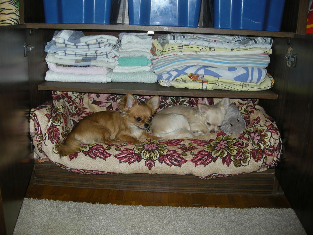У нас Ами очень любит спать в шкафу на нижней полке, где лежит белье. Она частенько туда залезала, если была приоткрыта дверца. Лилу тоже пыталась туда пристроится со старшенькой подругой, но Ами обороняла свое место и громким лаем выгоняла мелкую из шкафа. Сегодня складывала белье и Ами снова туда пронырнула. Я решила организовать там спальное местечко, убрала все белье с нижней полки, постелила мягкое одеяло и сверху покрывало. Ами полдня там сегодня проспала, и что самое интересное Лилуша тоже и Ами ее не выгоняет :dancers: Может раньше там было тесно, поэтому Амишка возмущалась. Вот посмотрите на наше новое спальное место.