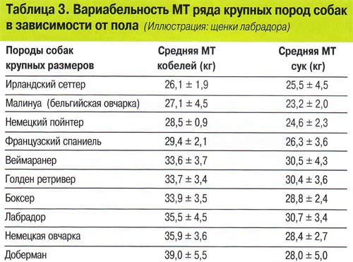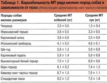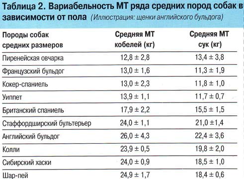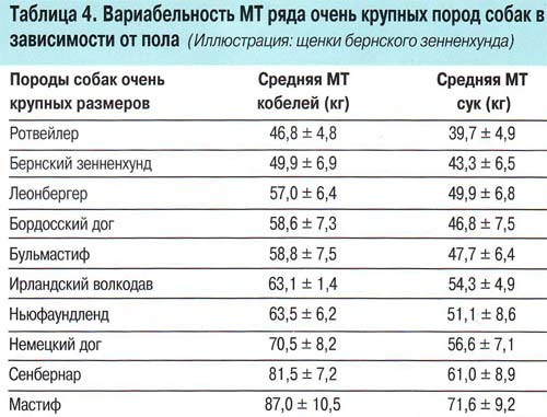 При расчете «взрослой» МТ собаки необходимо принимать во внимание се породу и пол: суки обычно созревают рань�?е кобелей. Однако половой диморфизм более выражен у собак крупных и очень крупных размеров.