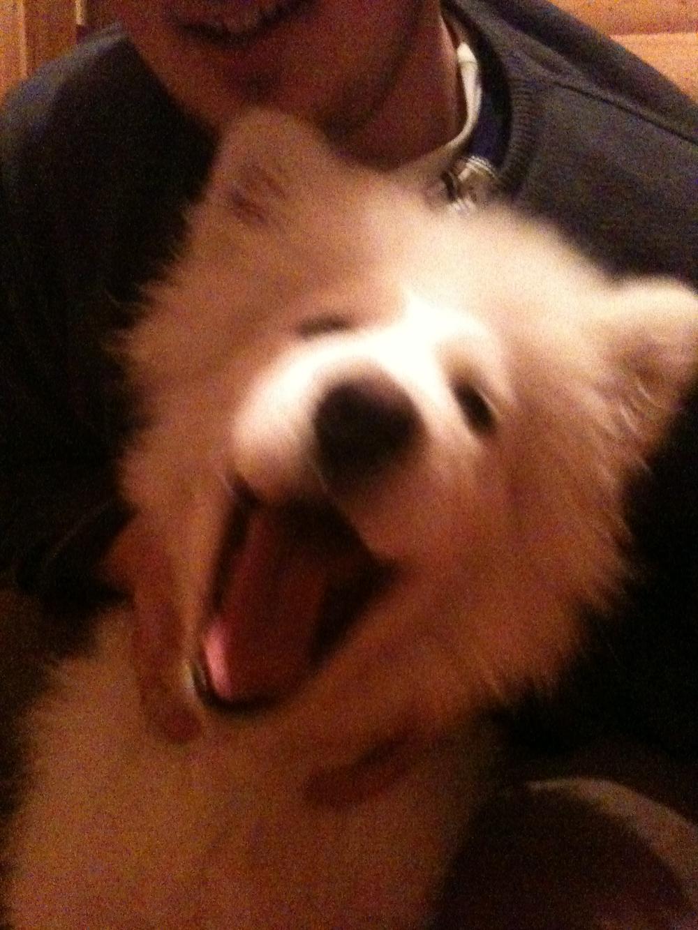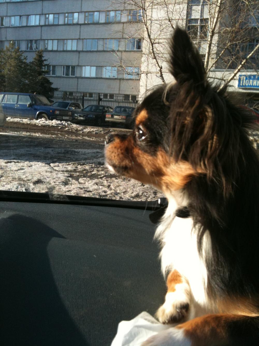 Первое куда мы ездили - это к родственникам на другой конец москвы. Это пока наша сама дальняя поездка с ней - 2 часа на машине. Дорогу перенесла хорошо, спала, пила иногда, только под конец уже обгавкала прохожих на автобусной остановке:grinning:
