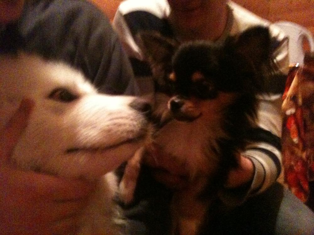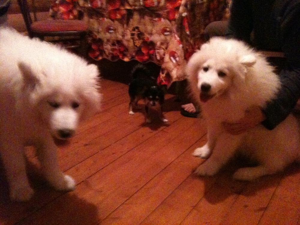 Потом мы ездили за город, тоже к родственникам, а там нас встречали два самоеда:grinning: Им 4 месяца, а они в 6 раз больше чем моя 7-ми месячная собака :laughing: