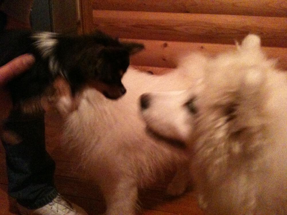 Мика их там быстро научила правильно себя вести. Потаскала их за щеки, еду изо рта повыковыривала и оккупировала лежанку:grinning: Если получится, то выложу видио, где она нападает на них, а самоедик только рот открыл и она ипугалась чутка, но нападать не перестала:laughing: