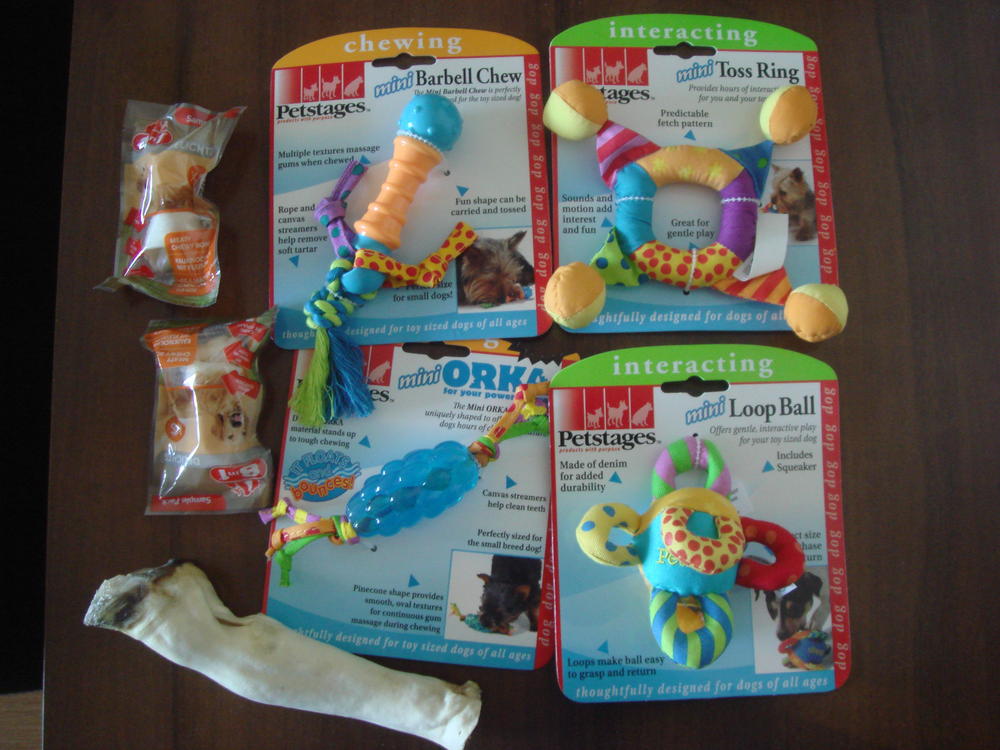 Здесь масло, погрызуха с желудком и игрушки вместе с косточками 8-в-1 и бараньей ногой.