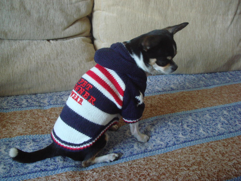 Вот кофточка Джема в стиле Tommy Hilfiger (опять таки, модные тенденции - символика Америки :smile: ), она на молнии на пузе. Плюс - наличие вязаной голубой подкладки, минус - состав: акрил. А вот свитер Джема со снежинками (той же фирмы) содержит шерсть. Кстати, сейчас Джем в нем спит. У нас в пятницу закончился отопительный сезон и в квартире холодно :holod:
