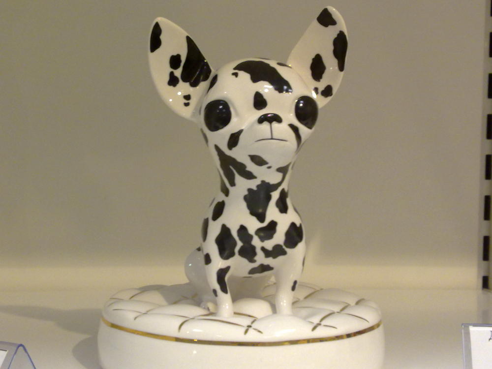 Вот еще одна чишка. Увидела в торговом центре Питера. Правда, не могу определить окрас :laughing: То ли далматин, то ли мерле, то ли "коровка". Кстати цена на нее была, как на живую :grinning: