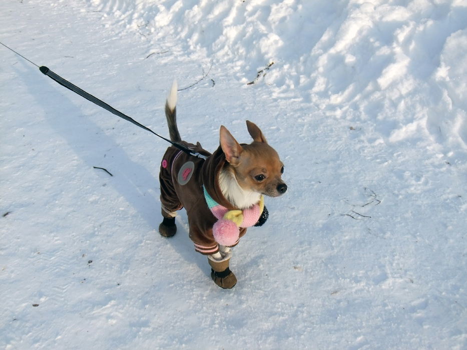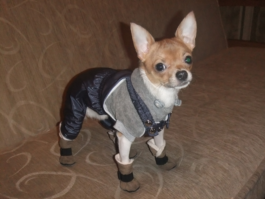 моему мальчику чихуа 4 месяца,первый раз вышла с ним гулять после карантина после бешенства. поставила его на снег-он на меня смотрел таааааааакими жалобными глазкамии лапки поднимал,купила ботиночки теплые-это ппц...он в них как инвалид-ножки в разные стороны тянет,пытаеться из них вылезти,так что мы решили,что обойдемся без бот,лучше когда холодно на ручках)))))