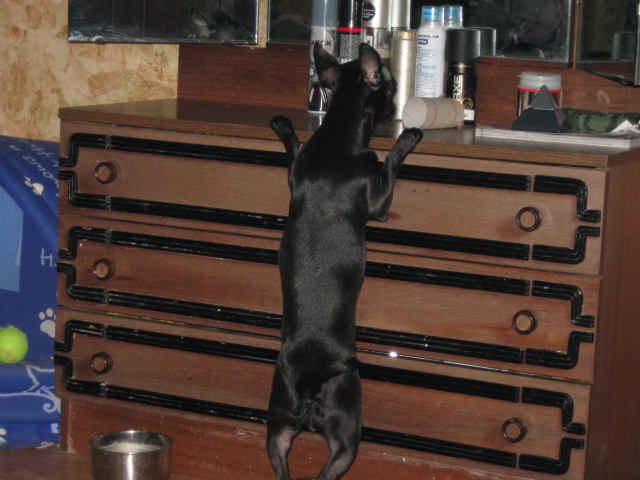 1. Боня пытается достать свою любимую забаву (картонный рулон от туалетной бумаги)))))