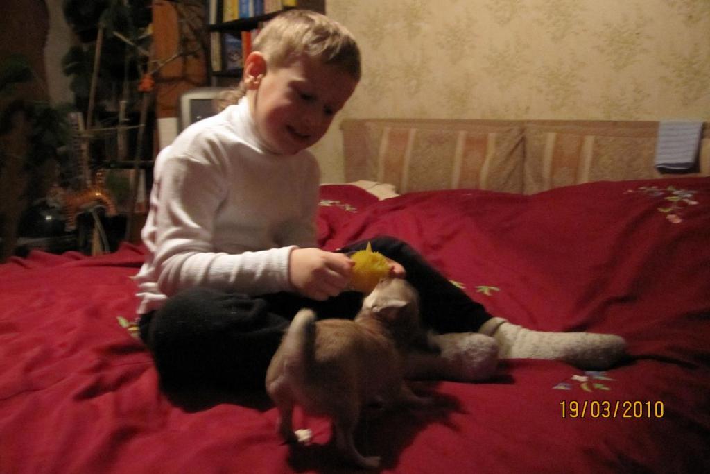 Так Фикешка полностью прижилась,спит с Ромкой под одеялом,ест только натуралку,бесится с котом,прячет все свои игрушки от моих девченок.Родители её любят,Ромка вообще с рук не спускает,единственное,что их напрягает-Фикешина пресловутая доброжелательность!Лезет и к маминым подругам,которым это совмем не нравится,и к Ромкиным друзьям,которые и на лапу наступят,и возьмут НЕ ТАК,и к друзьям брата,которым тоже это фиолетово,вообщем эта навязчивость всех напрягает!Я могла ещё понять,когда она приставала ко всем подряд у нас-может,чувствовала НЕДОЛЮБОВЬ или НЕДОВНИМАНИЕ с таким количеством ДЕТОК,но там она ОДНА на ЧЕТВЕРЫХ-мама,папа,брат и Рома,и все с ней возятся,так чего лезть к старой тетка-соседке и нализывать её?!Непонятно и очень раздражает!