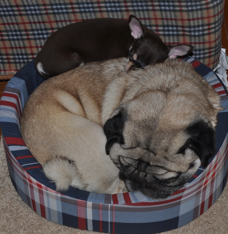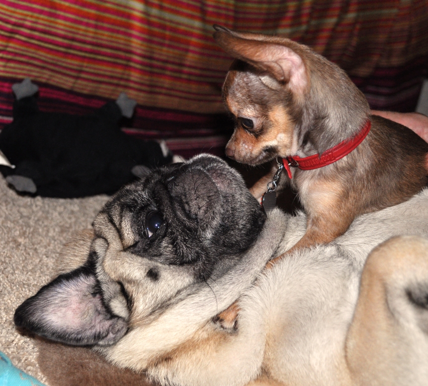 Фани сейчас 3 мес, по характеру лидер, любит использовать старого мопса в качестве теплого дивана)