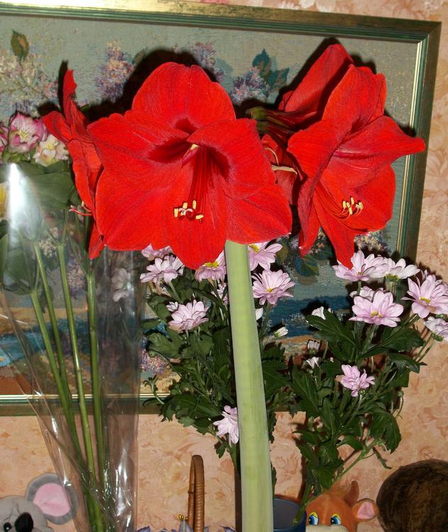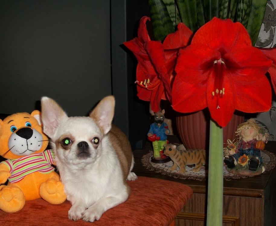 Наконец-то расцвел мой любимый амариллис. Конечно Тимоху на его фоне было сфоткать сложновато, вертун он еще тот. Ну жу что получилось... Ну и с горшком конечно наша с Тимохой бабулька-цветовод.