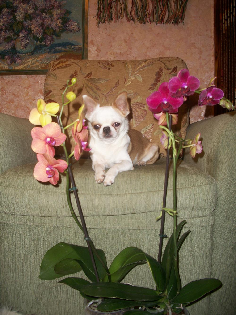 Супер орхидеи, а Тимошка на первой фотографии уже облизывается, предвкушая, что сейчас мама его и так и эдак с цветочками нафотографирует