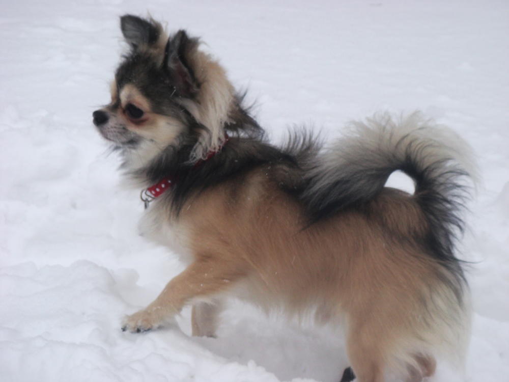 Наступила зима. Я, как любящая мама, перелопатила весь интернет о зимовке чихов. В итоге накупила курток, костюмов, комбезов, свитеров и обуви. Но! Ничего этого нам не пригодилось. С первым снегом у Лунтика столько счастья было! Чем выше сугроб, тем нам лучше. Стала ждать мороза, вдруг будет мёрзнуть. Морозы пришли -25, у нас всё по прежнему отлично - утренний кросс, обтирание снегом. Единственное, с приходом зимы - изменился окрас, но мне кажется это ему очень идёт.