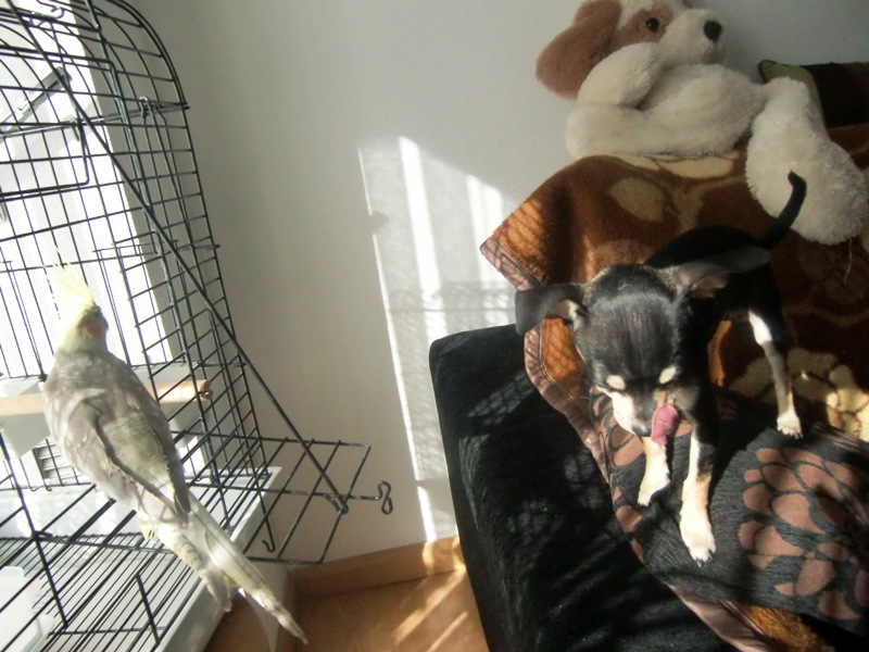 А во второй части Тотошка играет на диване на кратковременном , но оочень нежном зимнем солнышке.. и пытается съесть попугая (уже не в первый раз)