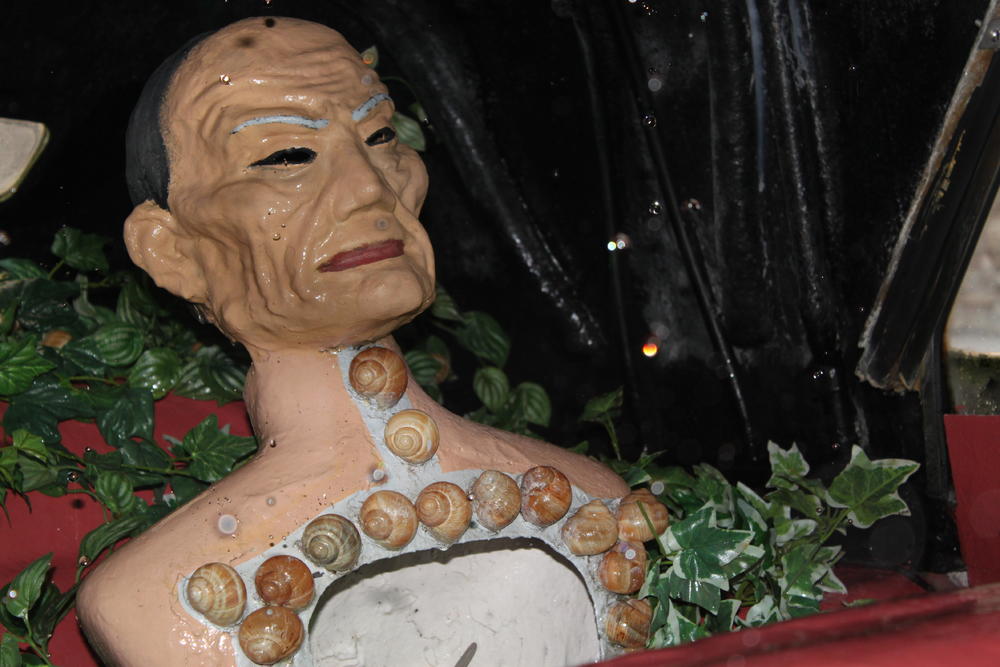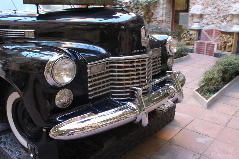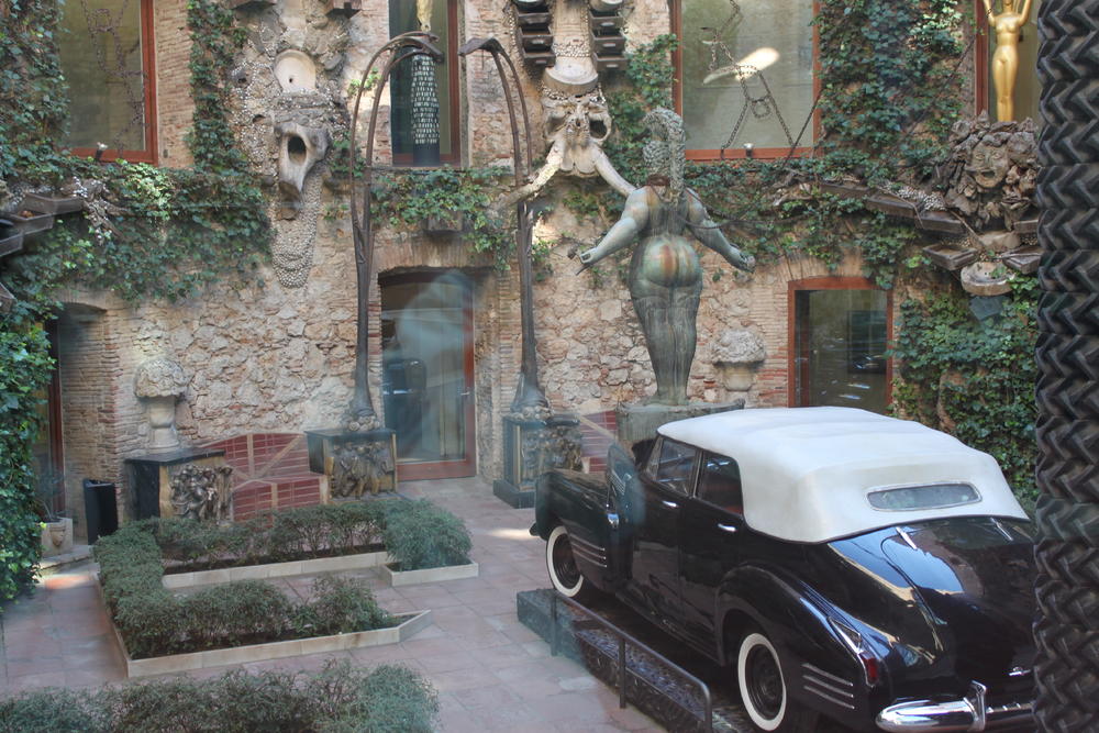 Итак, во внутреннем дворе музея расположена целая композиция, напоминающая театральную декорацию. В центре-"дождливое такси"-скульптурная группа с кадиллаком. Нам рассказали: в своё время Дали утверждал, что было сделано всего 6 таких машин, некоторые из которых принадлежали Кларку Гейблу, Рузвельту, Аль Капоне, а эту художник когда-то подарил жене. Возвращаемся, в наш двор: на капоте кадиллака стоит жуткая, огромная скульптура царицы Эсфири. В самом такси сидят парочка манекенов и их шофер. Через разбитые стёкла окон их трудно рассмотреть, но если бросить еврик, куда нужно, то внутри такси появляется сумрочный свет, начинает капать дождь прямо на виноградных улиток, которыми покрыты тела манекенов. Уф, у меня аж мурашки по телу побежали, когда я это увидела. Рядом с такси стоит столб, сооруженный из автомобильных/грузовых шин. На высоте этого столба стоит лодка, принадлежавшая Гала (жена Дали). Над лодкой-чёрный зонт, который, якобы, спасает её от дождя.