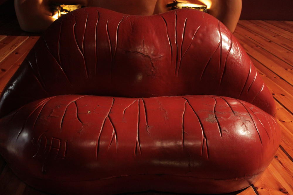 В зале есть камин-её нос; рот-он же софа, картины Парижа и Сены-два её глаза. Также есть уменшенная линза, через которую можно увидеть, как вся комната приобретает лицо Мэй Уэст. А на потолке расположена ванная,перевернутая кверх ногами. То есть, чтобы увидеть дно её ванны, мне нужно было всего лишь поднять голову)))