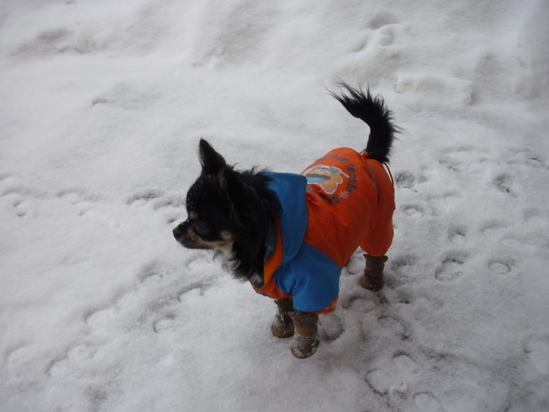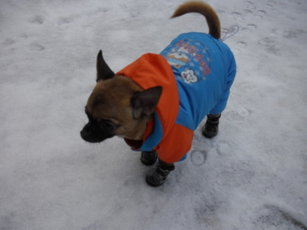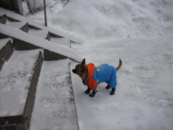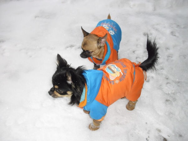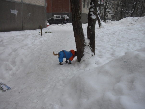 А мы сегодня с утра по-раньше налопались риса с курицей и пошли гулять.На улице хорошо-морозец небольшой и снежок слегка летит.Правда место для гуляний у нас сократилось заметно-из-за неубранных улиц многие машины ставят на газонах и все наши гуляльные места заставлены.Гулька как всегда быстренько сделала все дела ,проверила почту и собралась домой,да не тут то было-Лелька только в гулятельный раж вошла -пришлось и Гуле гулять за компашку.