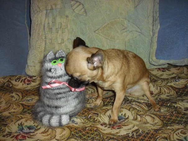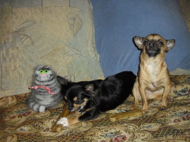 Девочки,у нас завелась дома ещ одна кошка....серая и пуфыстая!)))девчонкам она понравилась,но мамка ее отобрала.А если серьезно сегодня меня на почте ждал сюрприз-одна моя клиентка-прислала нам с девочками подарки.Девчонки получили по погрызушке.а я шикарного вязанного кота.Лелька жадюка сначала забрала одну косточку,а потом улучшила момент и приватизировала Гулину.