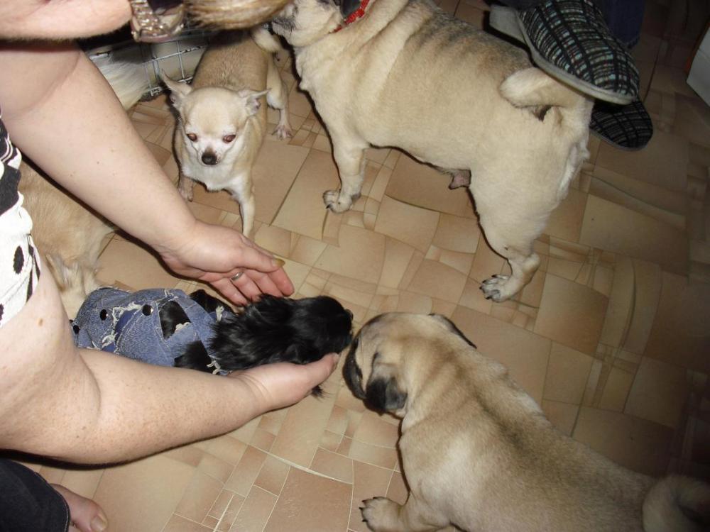 Вот те несколько фоточек которые удалось сделать в маленьком помещении.Лелька на ручках со своей мамкой Лешкой.Вид смущенный и молящий взгляд на папку и Гульку.У паки на руках с мамкой вместе.Никаких родственных чувств и узнаваний.Ну полное смущение среди собак.