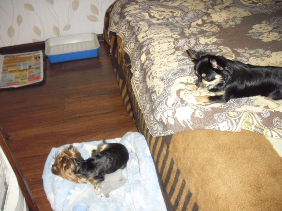 Лелик кидался игрушкой с кровати в Шэрри.а потом боялась за ней сбегать.то есть заигрывает.но опасается.А вот и первые фотки.Шэрри на мамкином халате,Лелька сверху наблюдает.Ну и Гулька-дутыш.)))