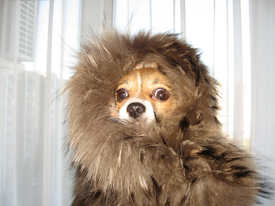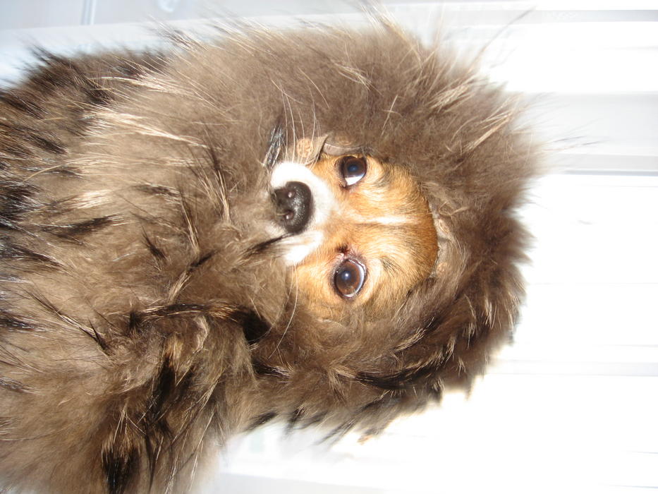 Это я достала мех,чтобы пристегнуть к куртке,а мамзель решила его порвать в клочья. Но мех напал на Соню, ему дочь моя помогла и крепко в неё вцепился,а я решила Соню в этот момент щёлкнуть.