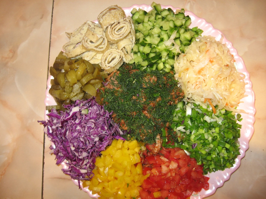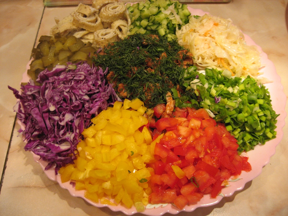 Вот хочу вам показать свой фирменный салат. Если кому интересно напишу рецептик.