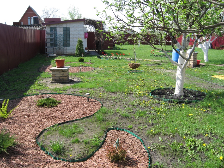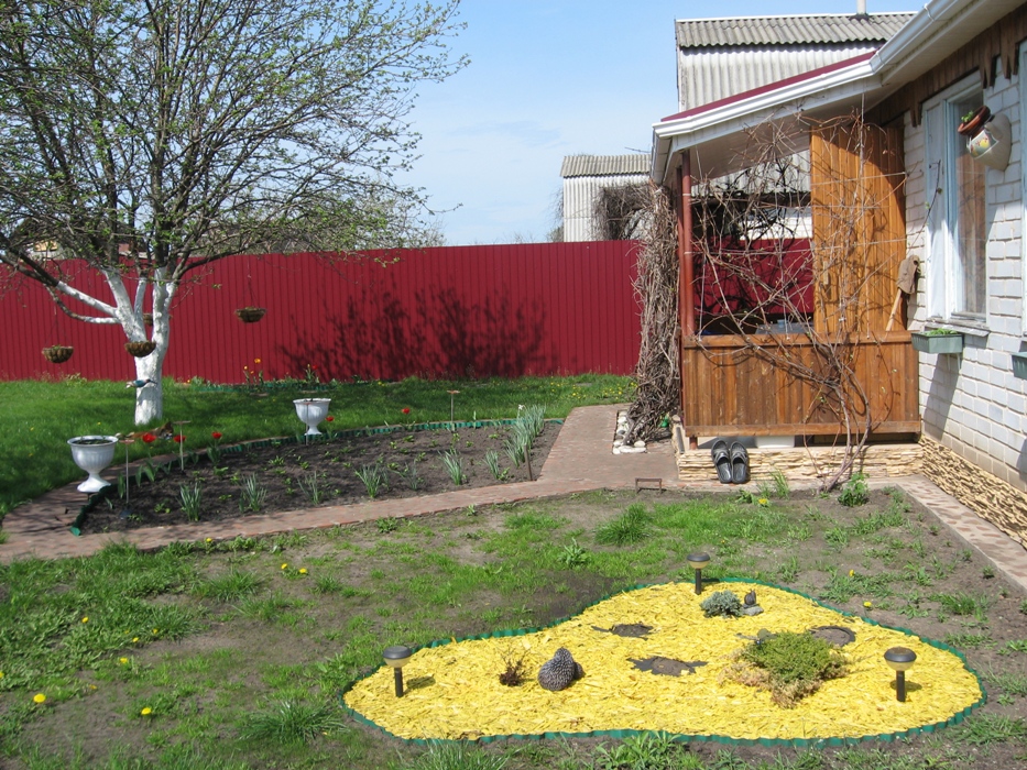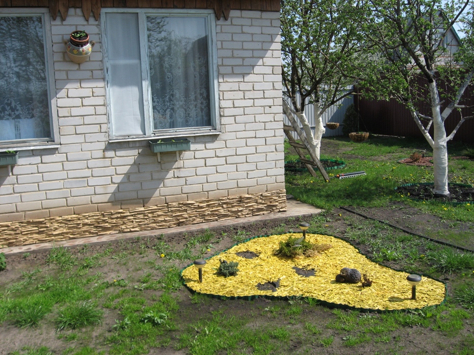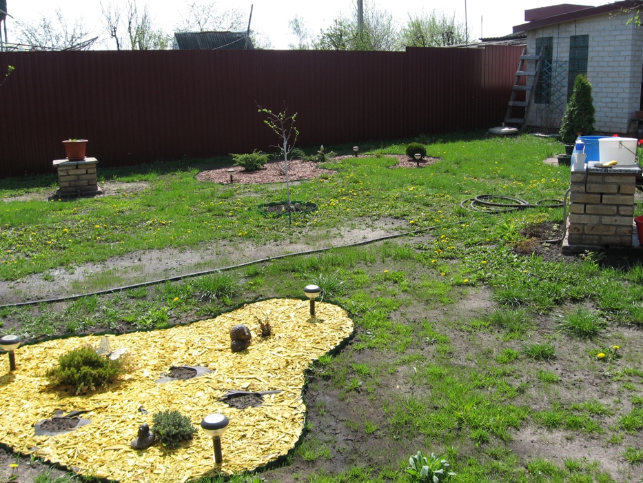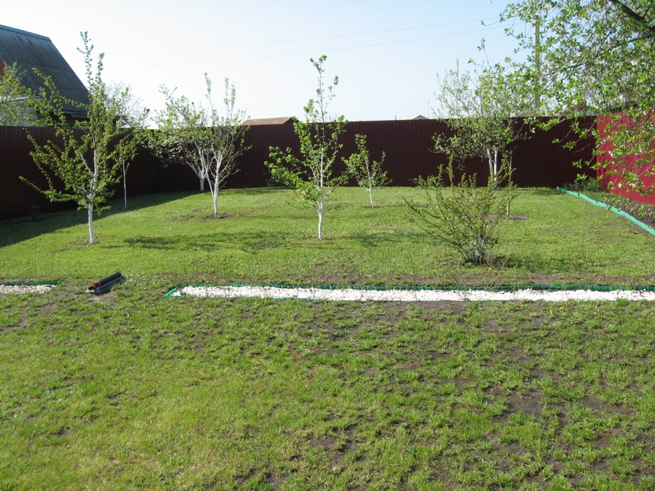 В белых полосах засыпанных мрамором два дня назад посажена живая изгородь из кизильника блестящего=)) На следующей год в зоне сада за этой изгородью планируется строительство беседки большой и вместительной и разбивка каменного сада.