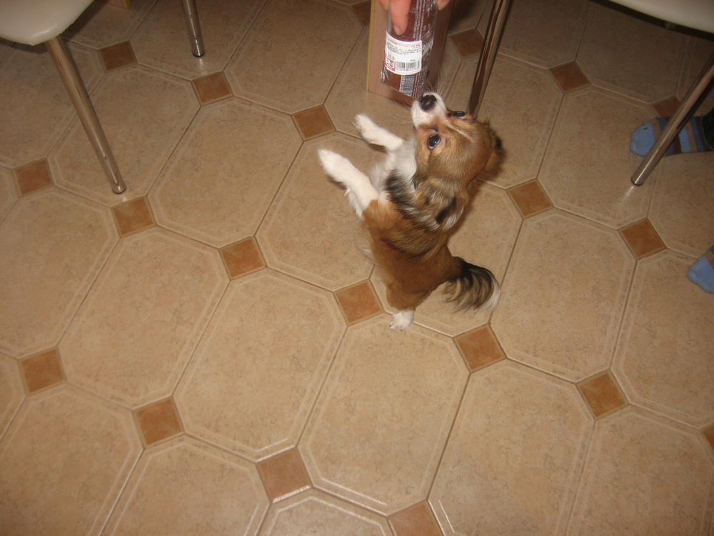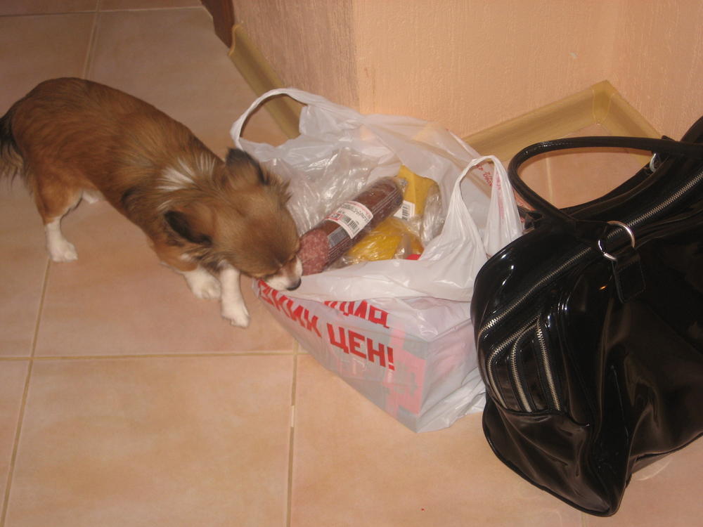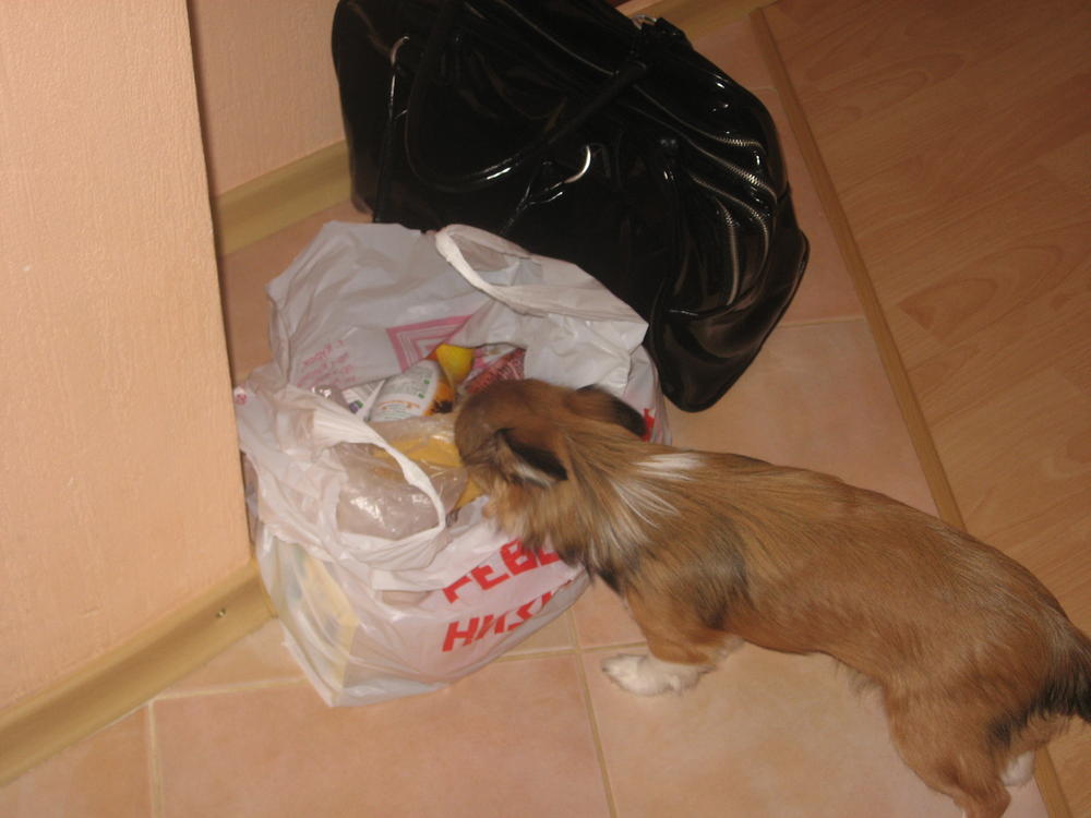 Первый раз Соня видела детей.Один Бог знает как я волновалась,чтобы Соня детям не причинила вреда,а дети ей. Но к моей радости после того как Соня облаяла старшую девочку 5 лет,девочка решила к Соне вообще не подходить. И нам стало хорошо и племяннице безопасней. А вот к мальчику 1,3года Соня нашла свой особенный подход сначала она считала его за иннопланетятина,потому что он бегал и визжал,а потом она поняла что всё что не даел Максим и уронил на пол может доесть она. И они чудесно провели время вместе,Макс кидал крошки Соня их ела.