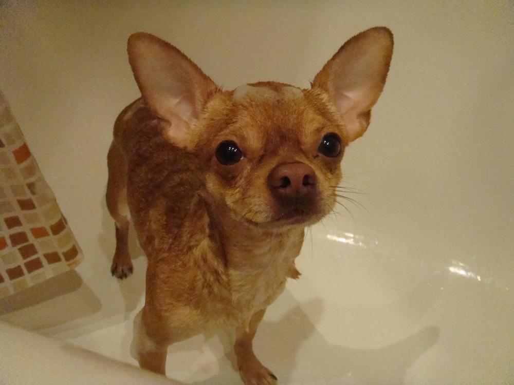 купались мы на днях...мордочка такая жалостливая "за что ты меня сюда" :grinning: