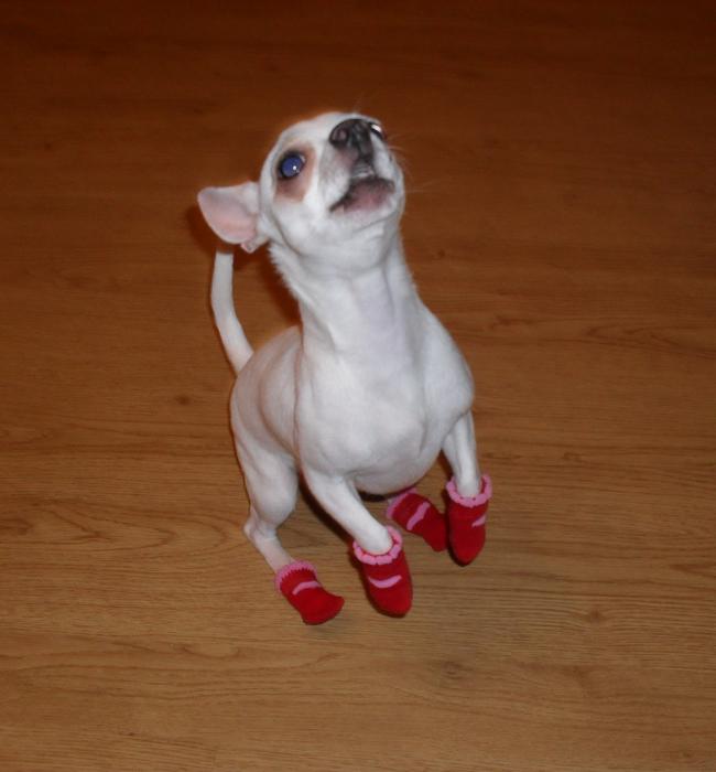 По завершению процедуры, поставила его на пол, он сначала обнюхал носки, потом сделал несколько шагав, не отводя с них взгляд, потом пробежался - было весело. Он забежал на пеленку, наступил на подсущенный попис, и снова их понюхал.