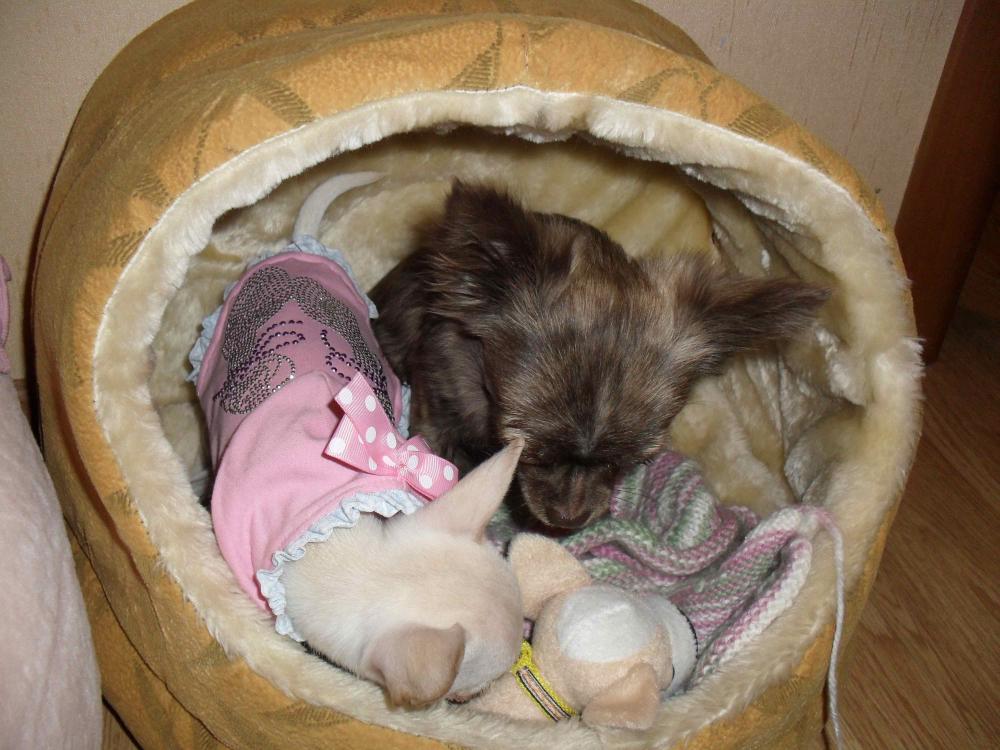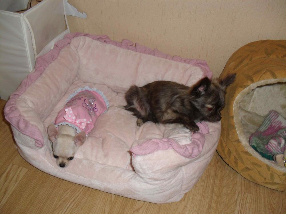 Наконец-то я добралась до компа. Выходные были ударные - некогда было даже залезть в интернет. Мелкая освоилась, выселила Юмаху из домика на диванчик, прохода ей не дает. Юма теперь носится за маленькой, бдительно следит чтоб ее никто не обидел. Приходили гости,так она не отходила от них пока не посадили маленькую на пол. В субботу были с младшими детьми на выставке, прикупили диванчик, ну и всякую всячину старшей и младшей.
