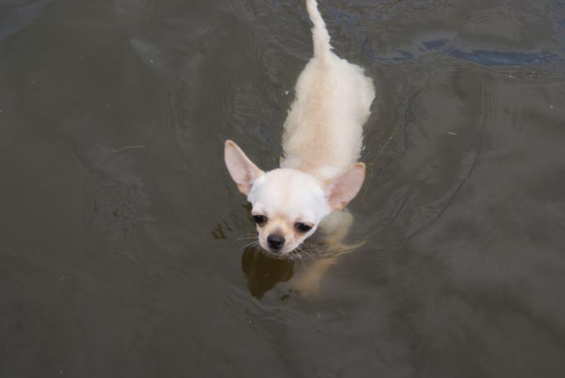 Нет она у нас ничего не боится. Плавала с удовольствием. Правда потом немного тряслась пока вытру или пыталась повалятся в пыли.