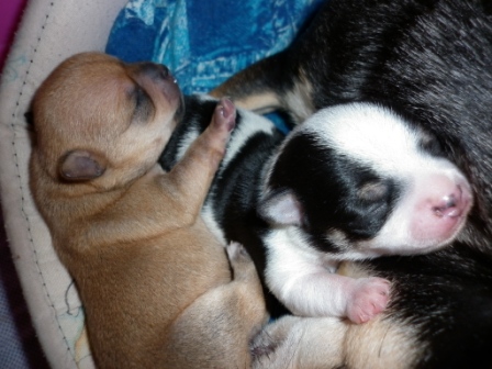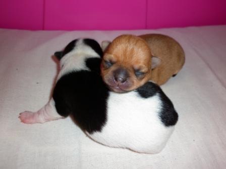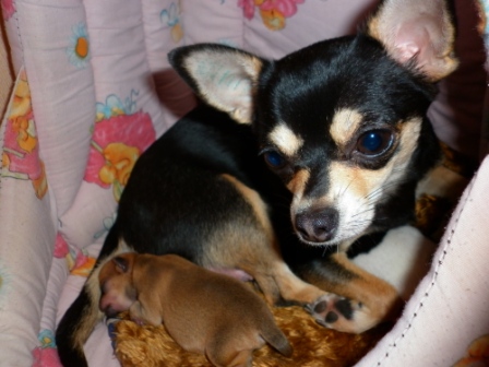27 сентября у нас появились крошечные чишки - мальчик и девочка! Это были наши первые роды, мы очень переживали, готовили телефон доктора, лекарства. А Масяня спавилась отлично сама! С утра рыла, в три часа схватки - и два щеночка с промежутком в час! Конечно, помогала роды принимать и сестра Масяни - Кнопа, и ее ожидания не обменулись - племянник родился такого же окраса.:laughing:, в тетку.Она его сразу полюбила, так и лежат - Масяня с детьми в домике, Кнопа - рядом, прислушиваеться к каждому шороху, заглядывает - все у вас в порялке?
