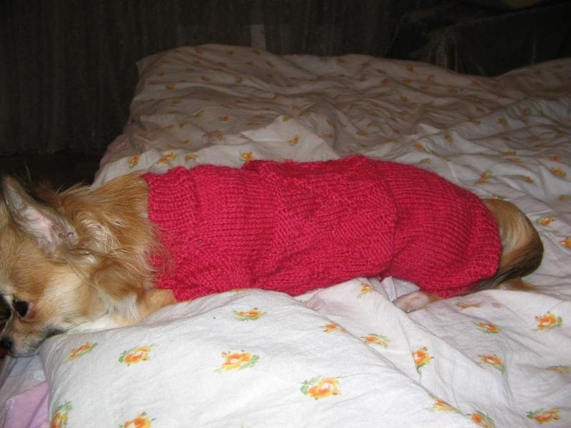 Оля, классный свитерок получился и вовсе не длинный - попу отлично закрывает. Присоединяюсь к просьбам выложить выкройку! Очень хочется и свою собу принарядить, у нас бабушка уже готова за вязание засесть! :smile:
