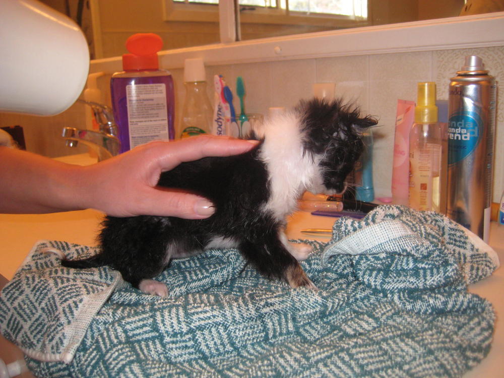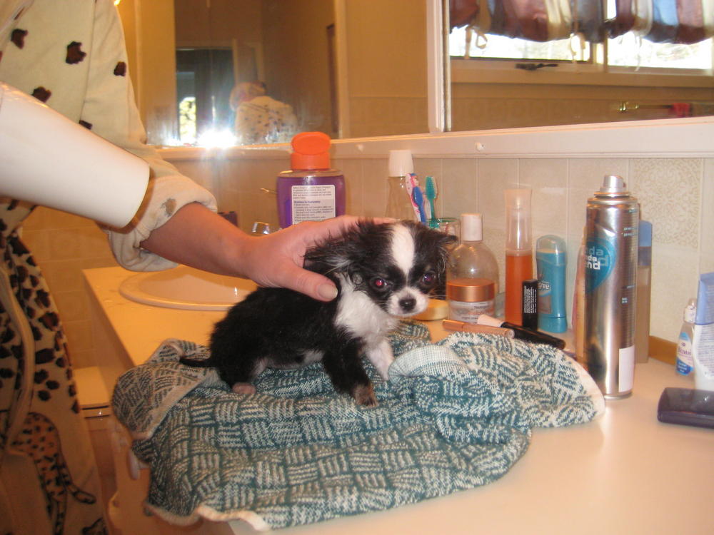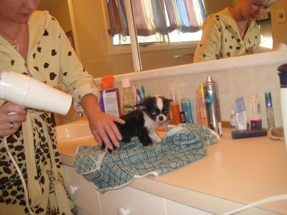 Высушила ее феном,она не шугалась...даже хотела укусить его,поняла что бесполезно рычать и спокойно досидела до победного конца....