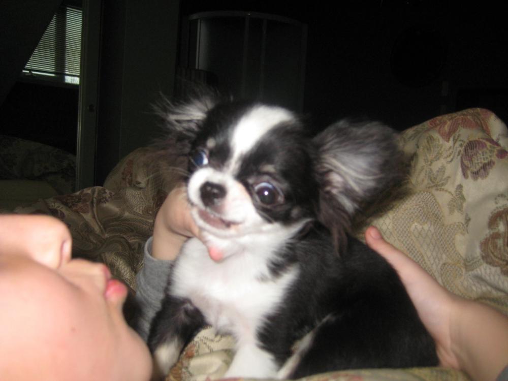 Он маленький,проблем с ним не отберешся,мордочка немного не такая как я хочу,в придачу мальчик...,если будет противный,то я не полюблю его,Лялька мне это не простит,две собаки в доме....Это минусы.