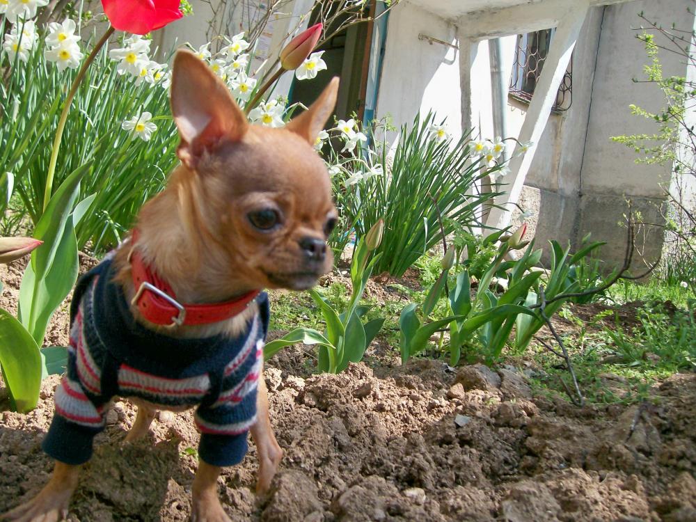 Сегодня холодный ветер дул, решила надеть на именинницу свитерочек, сфотографировала рядом с подъездом, видно, что уже тюльпаны распустились.