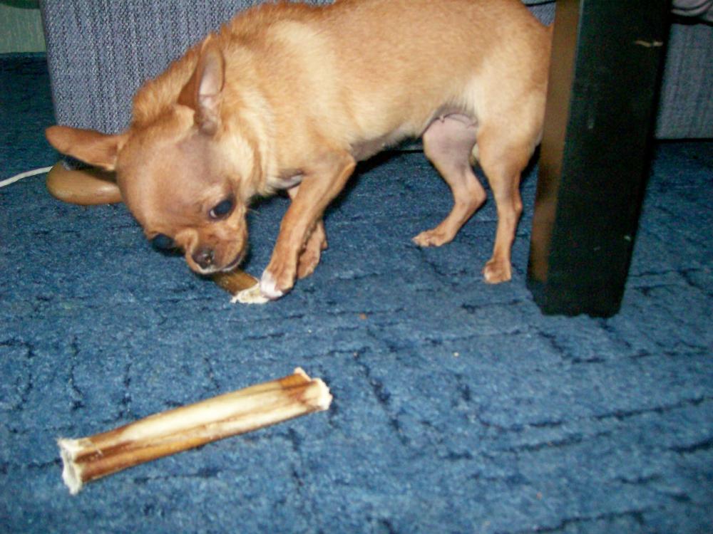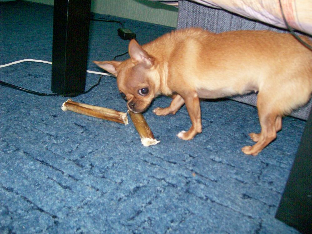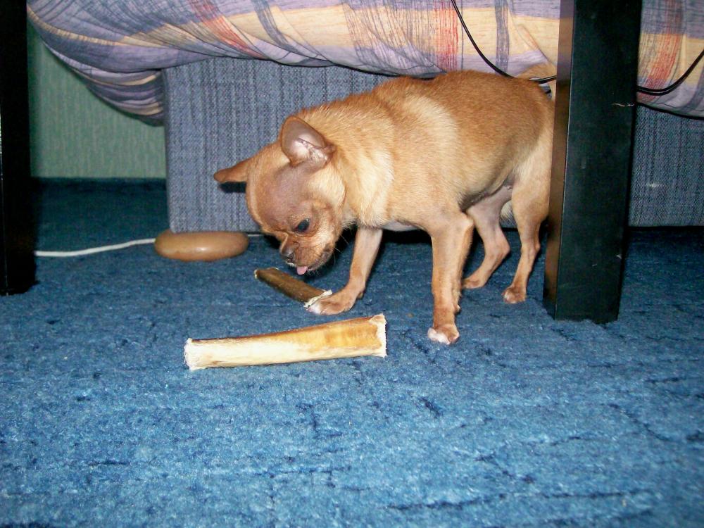 Ириша и Леночка, которая Тимошкина,, вы не поверите, но я сегодня тоже купила этот, будь он не ладен, корень.Мы с Сашей зашли в клинику, а при ней магазин зоотоваров, мы одежду смотрели для Джули, и что вы думаете, лежит этот красавец на витрине, я аж глазам не поверила. Мы взяли тоже 2 штуки на пробу. Джессика сразу отошла, она абсолютно равнодушна ко всякого рода погрызушкам, кроме натуральных косточек с мяском, а Джуля отнесла свой под диван, потом прибежала на кухню и забрала Джеськин. Положила все это, грызть не стала но охраняет, как зеницу ока. Стоит подойти, сразу шерсть дыбом, бросается, как дикий зверь, типа не тронь, убью!!! Так что не знаю, возможно и грызть эту "прелесть" никто не будет. Я сфотографировала ее звериную моську, охраняющую пенисы, чуть попозже выложу фотки. Сначала по гостям похожу.