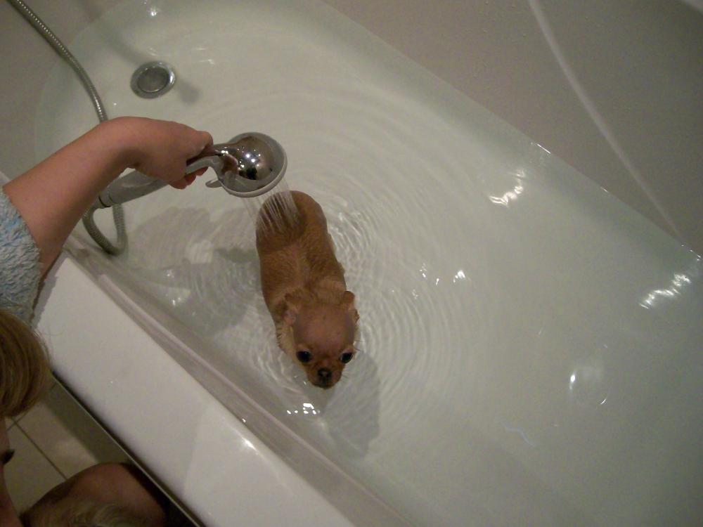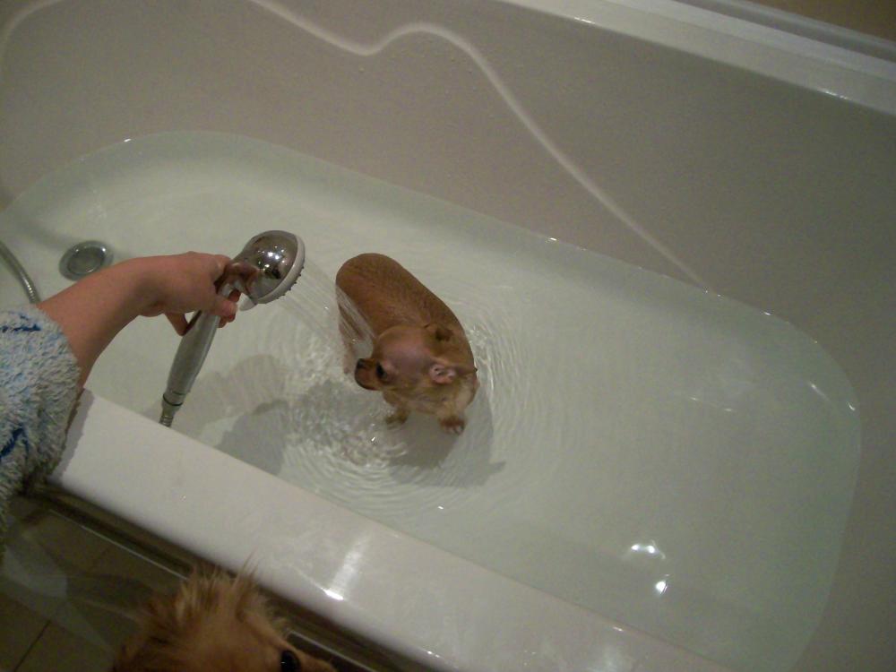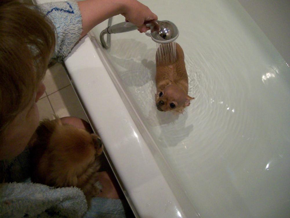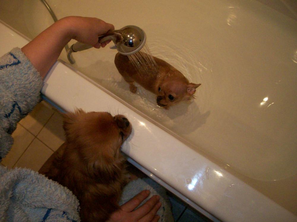 Вчера Джулька напросилась купаться. пришлось уступить. А Джессика наблюдает за процессом.