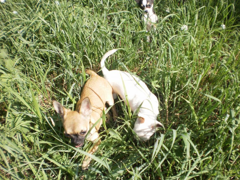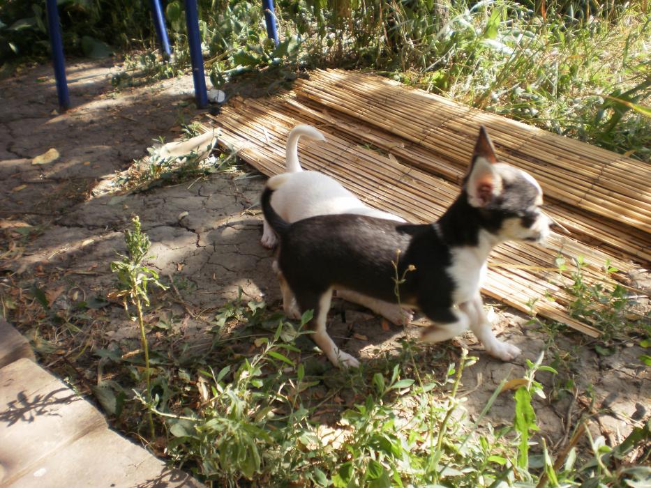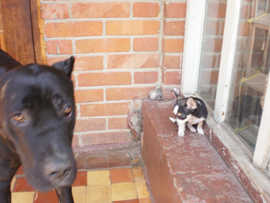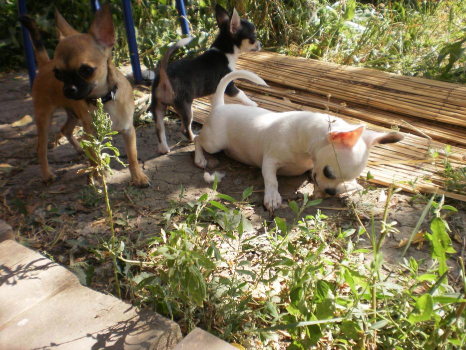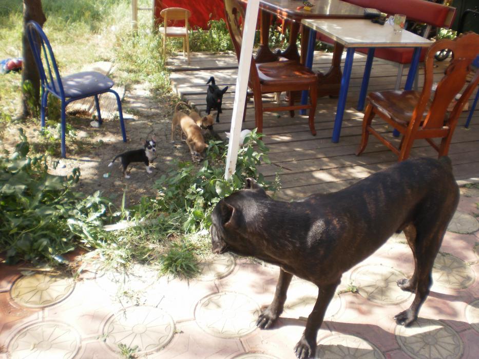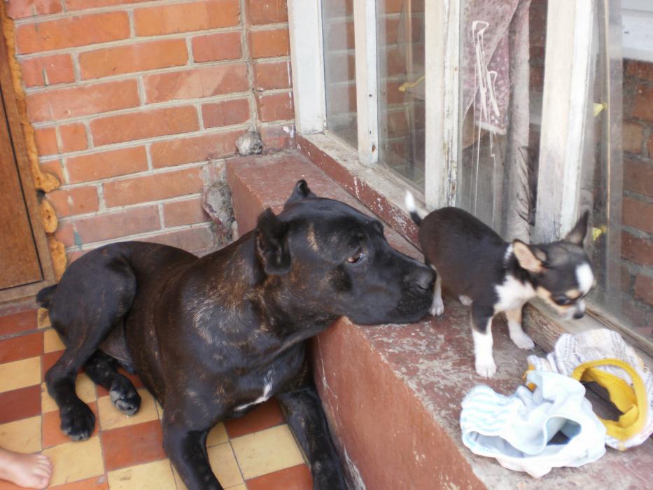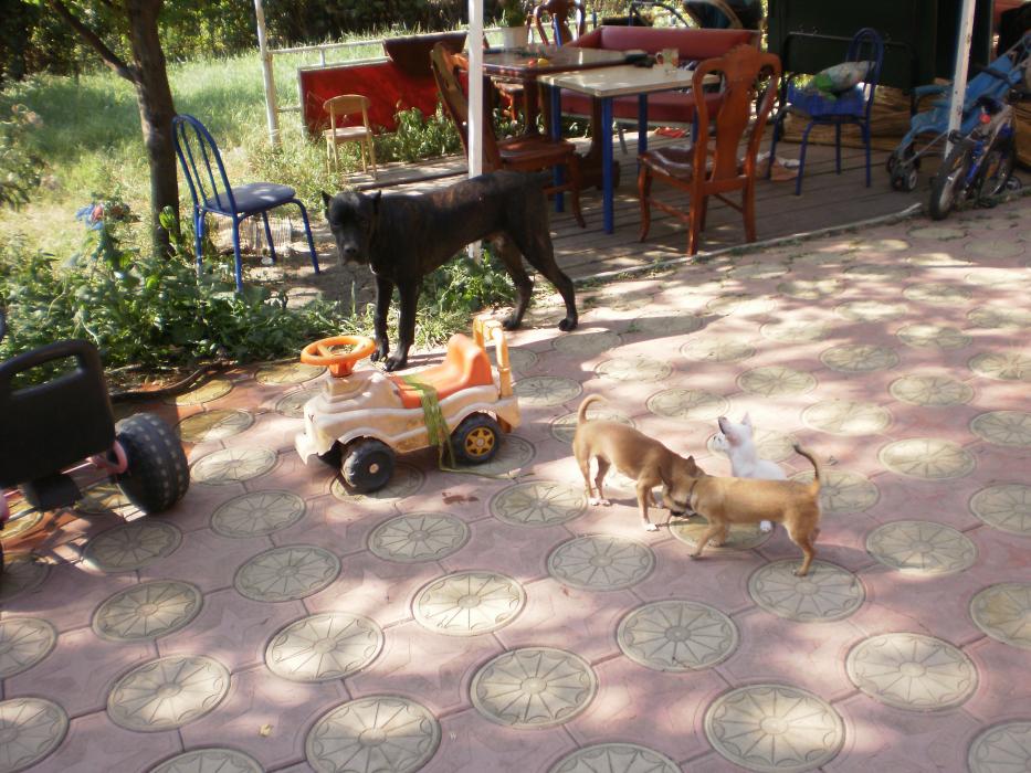 С ними гуляет наш молодой охранник Бэн!Он за ними так наблюдает,но не подходит,мы смеемся )))Он лежит,а эти заразы мелкие все косточки хапают и в наглую грызут около него ,он ноль эмоций.Вообще мне очень нравится эта порода,хоть ему и 7 мес.,но он понимает ,что они маленькие и не пытается с ними играть ,просто ходит рядом и охраняет!Вообще не сигает ,не ставит лапы на грудь,как стаффы питы ,ведет себя как взрослый пес.У корсов в крови охрана хозяев их собак и имущества,их не надо этому учить!!!У Дени с Бенов все в шоколаде,он его ни разу не боялся)))Если у Дени косточка,то он идет за Бэна и грызет ее там ,что бы другие не забрали.Кармэн его боится,как он в дом заходит,она на него гавкает и он уходит)))