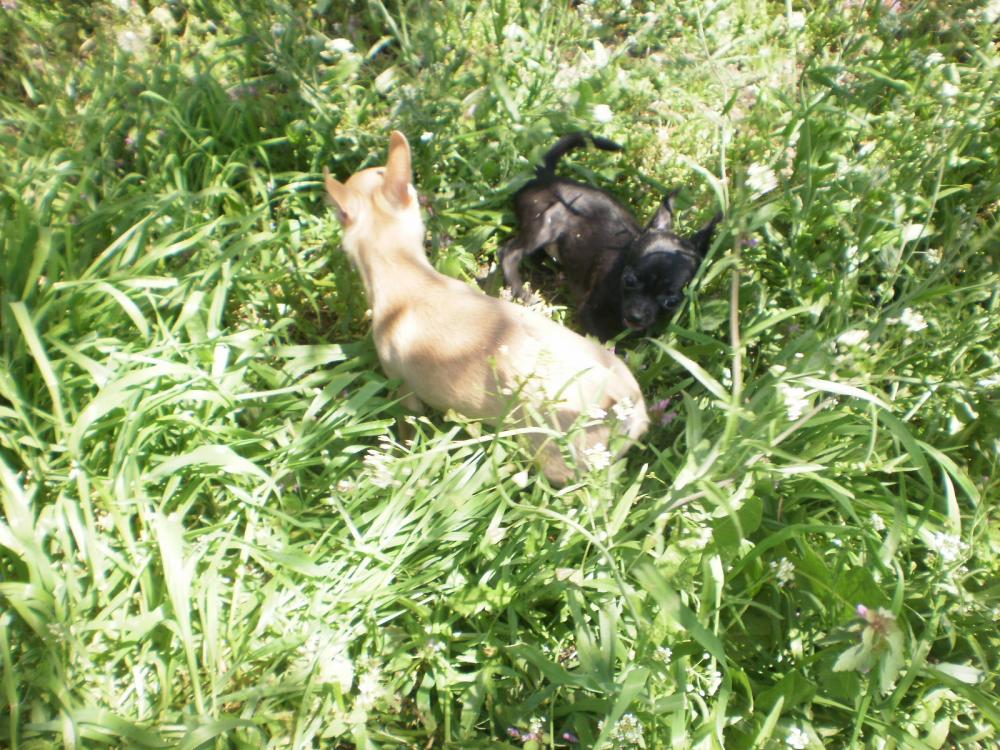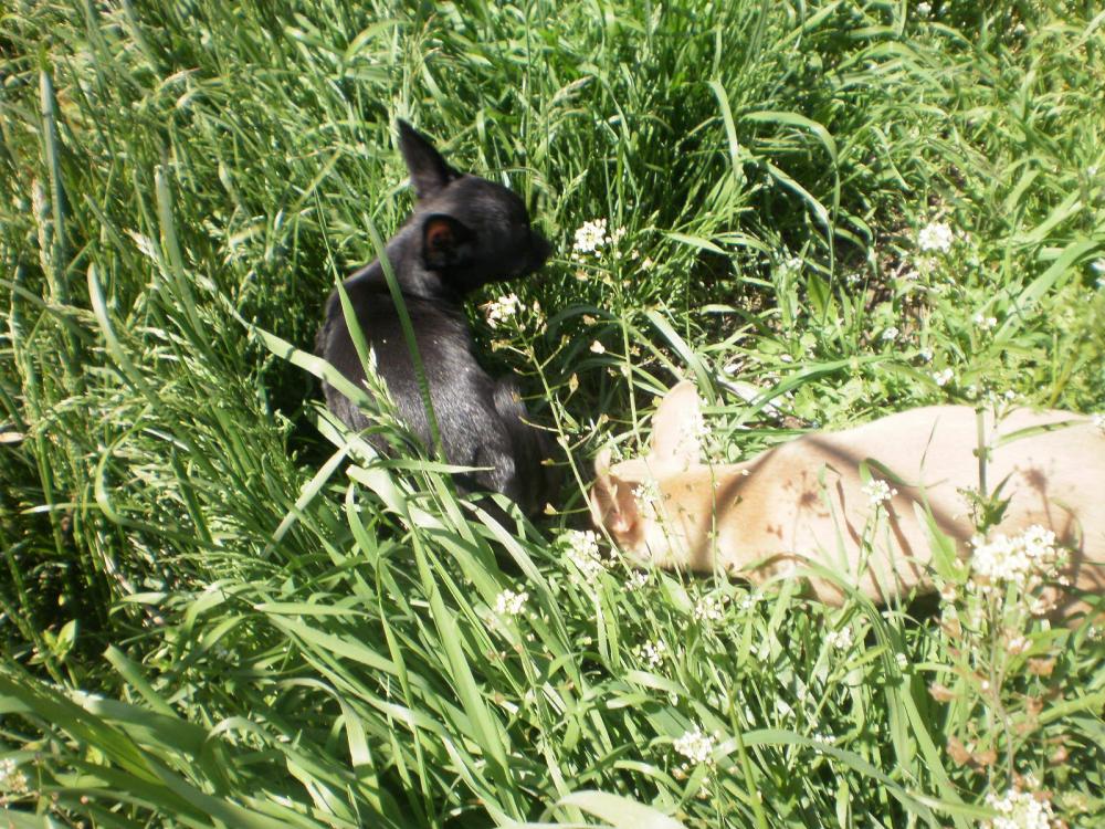Сегодня мои девочки,гуляли я не выдержала.У нас во дворе правда ,они носились так ,что языки весели на плечах :tearsofjoy:Такого я еще не видела.Они просто бегали друг за другом по кругу и волись кувырком.Они даже не представляли ,что столько может быть травы, земли,муравьев ,воробьев и ящериц это было что-то.На улице у нас вольер где корс и дворик сидят смотрю ,а эта сучка Яся лезит к ним в вольер ,там такая маленькая щель размером с ее голову.Уши поджала,хвост поджала,смотрит истомно на Бэна и лезииит.Мне это картина напомнила Маугли ,когда питон мартышек гипнотизировал.:scare:Бэн нее действует как то странно.Я ели ее от оттащила:netttt:Побегали часок,забрала с улицы ,захавали всю еду с жадностью,выпили кефир воду и спят без лап уже два часа.:dancers:Вот так наверно у них ,только будет аппетит.