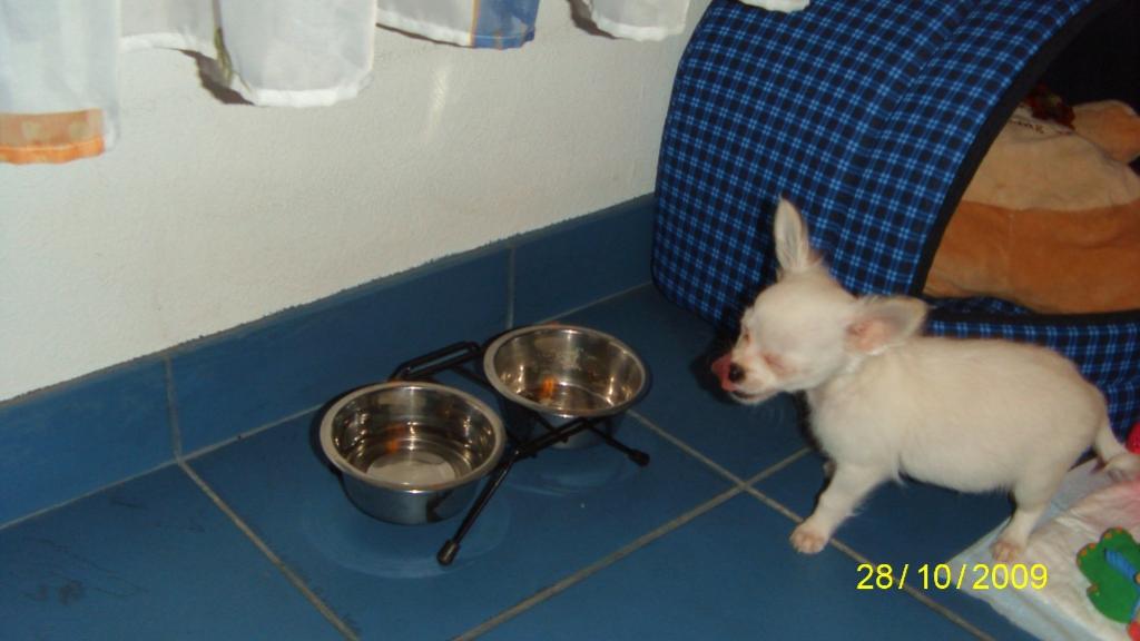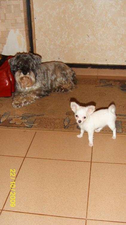 Весим 1.8. Кушаем Royal Canin, морковку. Шкодничаем в разные углы, гоняем цверга. Очень нравиться гулять вместе со старшим четвероногим другом. Тявкаем на все что движеться. Одеваться не любим. Все пальцы прокусаны.
